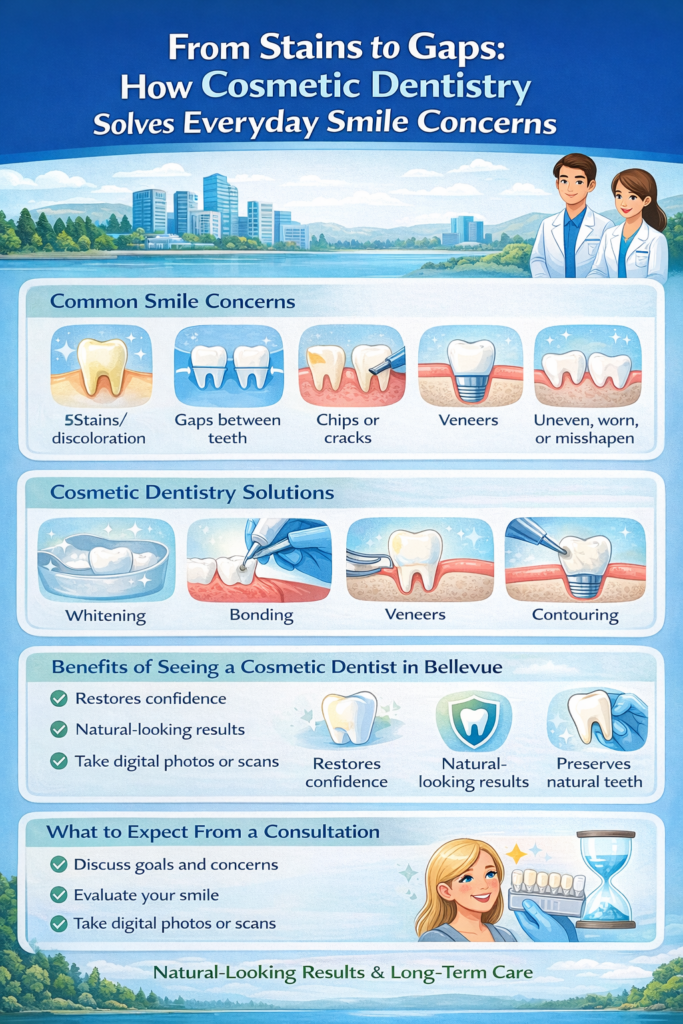 If you’re bothered by tooth stains, small gaps, chipped edges, or uneven teeth—but your teeth are otherwise healthy—a cosmetic dentist in Bellevue can help you explore conservative, appearance-focused treatment options that fit your goals.