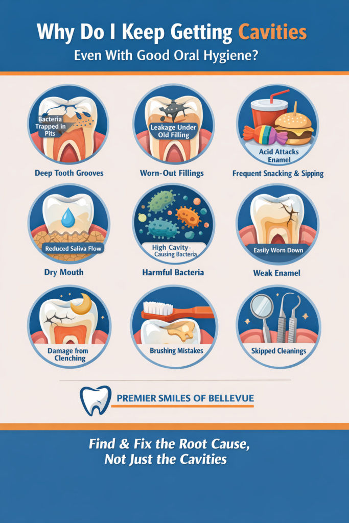 If you’re tired of dealing with repeat cavities and want answers—not just fillings—Premier Smiles of Bellevue is here to help. We focus on prevention, precision, and personalized care so your smile stays healthy for years to come.